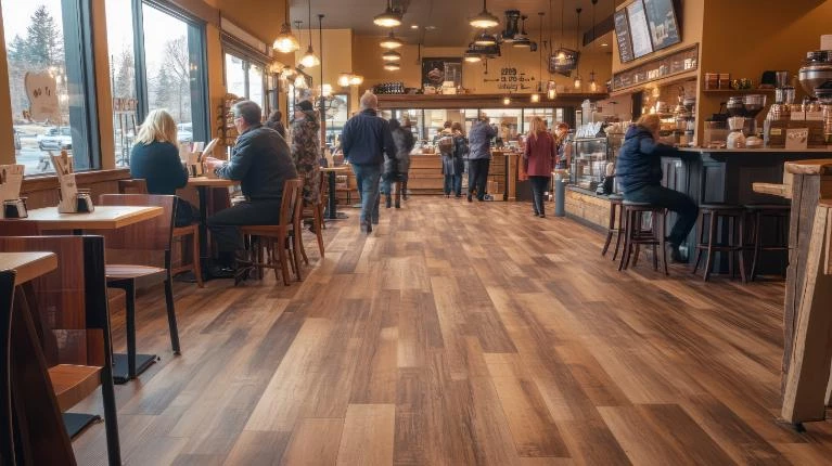 Café flooring must withstand heavy foot traffic, daily cleaning, and occasional spills while contributing to a welcoming, on-brand atmosphere for customers.