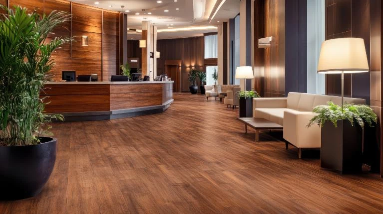 Engineered wood flooring is ideal for reception areas, lounges, and suites where luxury and performance are key